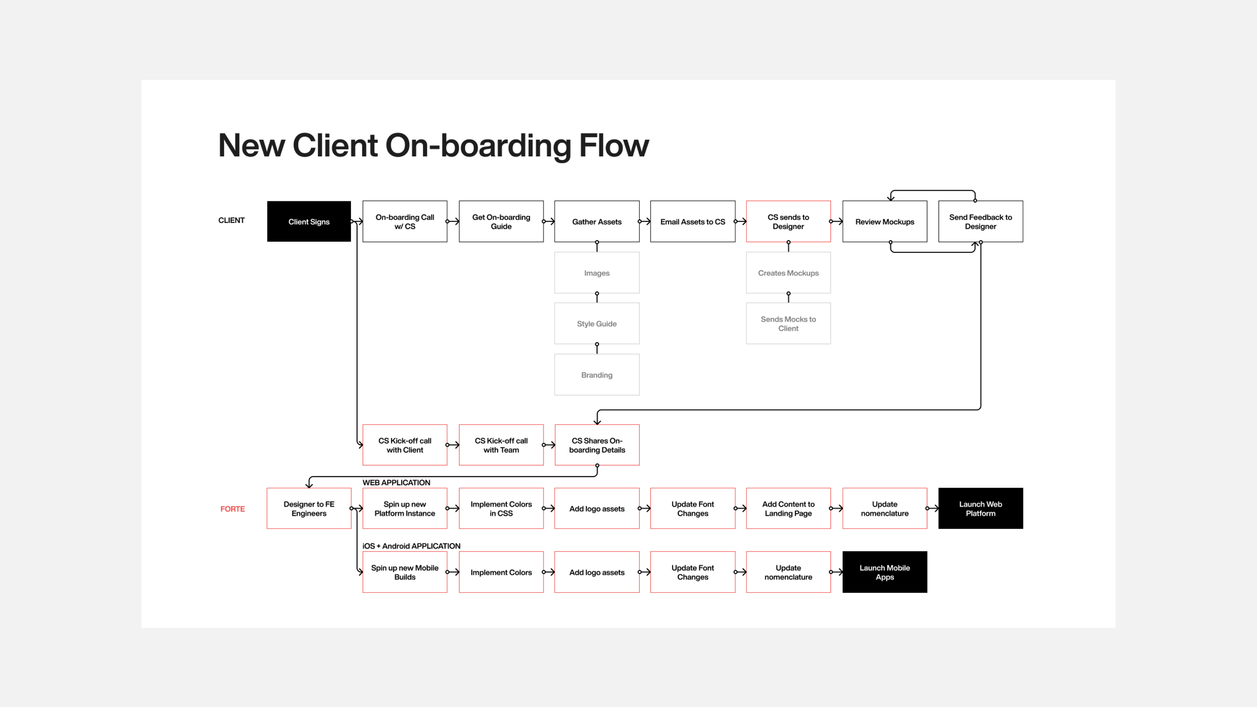 After documenting the findings, I put together a flow map to help visually understand the entire process, from a client being signed to their platform launching. This helped me and the team see the flow visually and the amount of involvement from the team the process required.