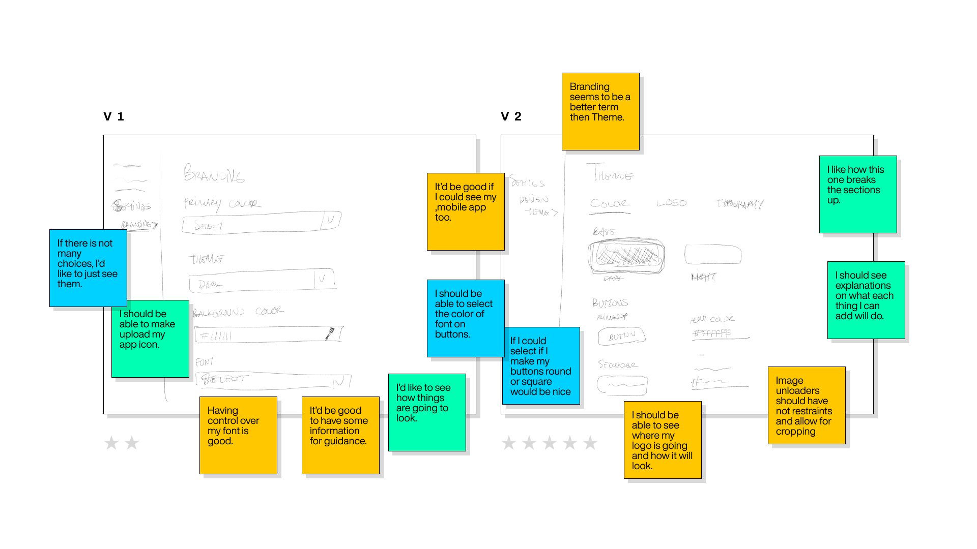With the a solution direction in place and the design system created, I quickly designed a working prototype to put in front the 5 client platform admins that I had the discovery sessions with. In addition, I created a set of tasks for them to execute on the prototype such as: changing the main background color of the app, changing the color of the primary button, changing title font, and adding their logo. These sessions gave me insights on what tasks the users found difficult to do or accomplish and what things they found difficult to understand.